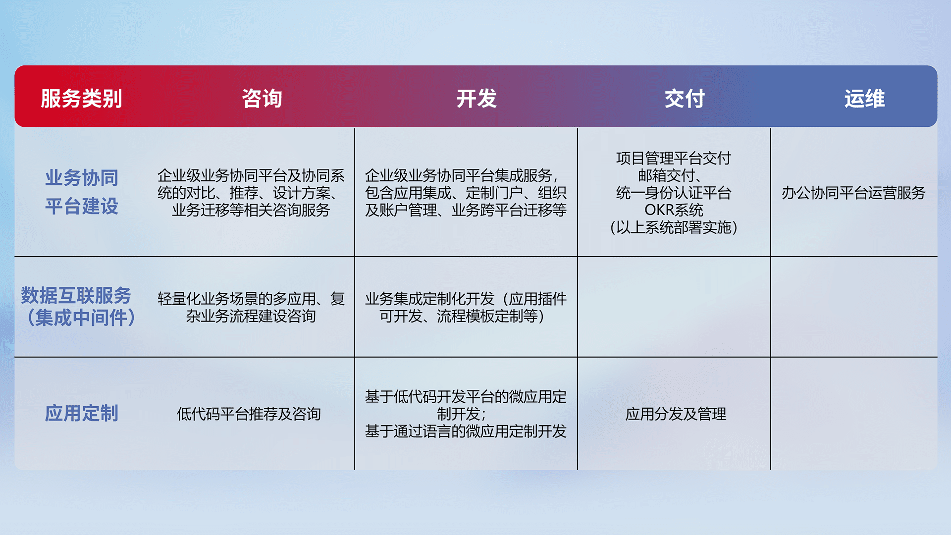 针对钉钉、、、企微、、、IDaas等平台级产品提供产品的规划、、、方案、、交付、、、、定制化开发等服务,,,实现如统一协同办公、、、、智能客户服务、、、混合会议管理、、、、智能数据查询、、、等业务场景,,,,实现数字化转型。。